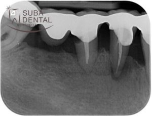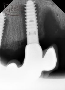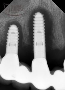 Due to the omission of regular check-ups and heavy smoking all the implants had to be removed as they had all developed peri-implantitis around them. Bridge replacement was out of the question. The dark shadow around the implants signifies peri-implantitis.