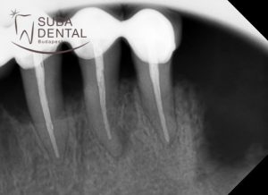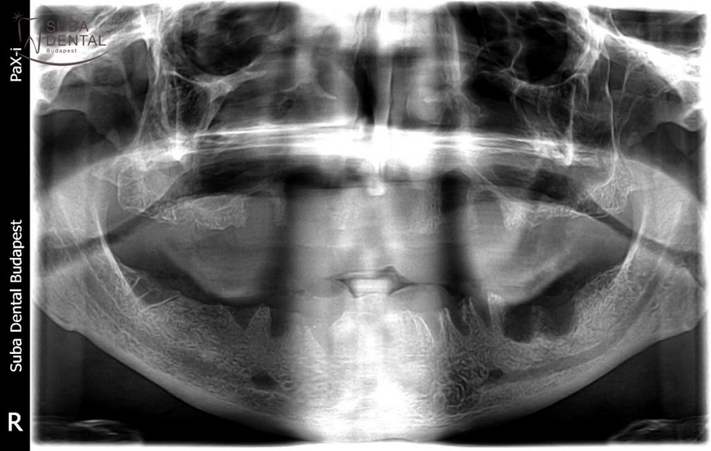 Panoramic radiography was performed and intraoral X-ray scans were recorded of the current condition in order to determine the cause of the problem. It was readily visible in the X-rays recorded that both the patient’s teeth and the implants previously received were beyond repair and the inflammation, infection, bone resorption and peri-implantitis around them indicated the removal thereof (explant surgery). These dental foci may, among other things, cause heart disease, hair loss, dermatological issues and joint complaints.