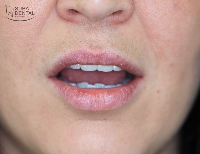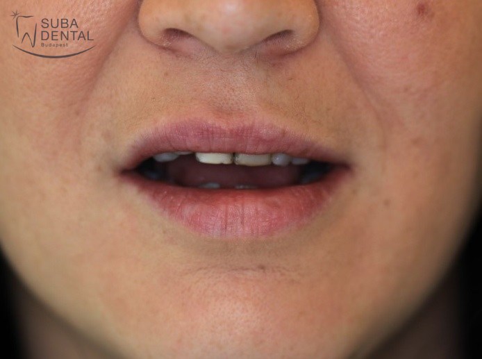 At the first encounter a panoramic radiograph and photographs were taken of the teeth. The radiograph and thorough examination of the mouth revealed that the upper left premolar had chipped off and needed to undergo a second root canal treatment and to be reinforced with a post and core for the secure retention of a crown. The upper two central incisors and right lateral incisor had also been root canal treated and needed to be reinforced with post and core abutments. After weighing the options with the patient we decided in favour zirconia crowns to be placed on the upper incisors and the chipped-off premolar. Aesthetics can be best restored with a metal-free solution but since the teeth were root canal treated and had post and core abutments our choice fell on zirconia crowns instead of all-ceramic crowns.