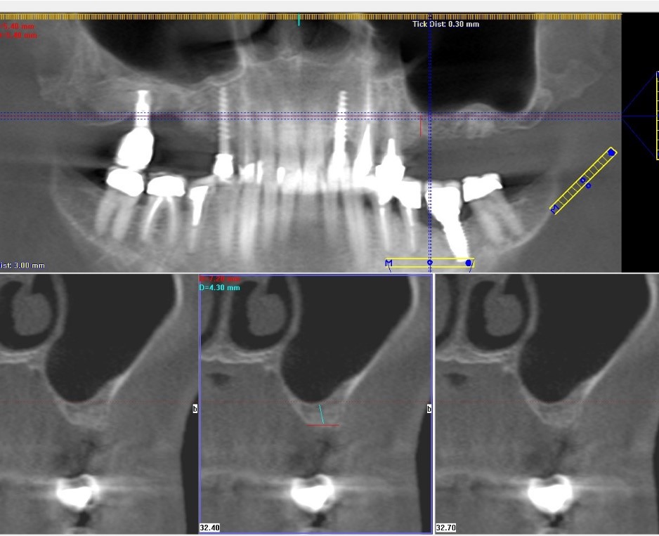 Le scanner, qui montrait la mâchoire supérieure et le sinus, nous permettait de mesurer la hauteur et la largeur de l'os en 3 dimensions. Dans les 3 plus petites images plus petites, il était clair qu’il n’y avait que 4,3 mm de hauteur qui n’était pas suffisant pour la pose d’un implant. C’est pourqoui, un remplacement osseux (sinus lift) était nécessaire. Si la hauteur de l'os est supérieure à 4 mm, le remplacement osseux peut être fait en même temps que la pose des implants.