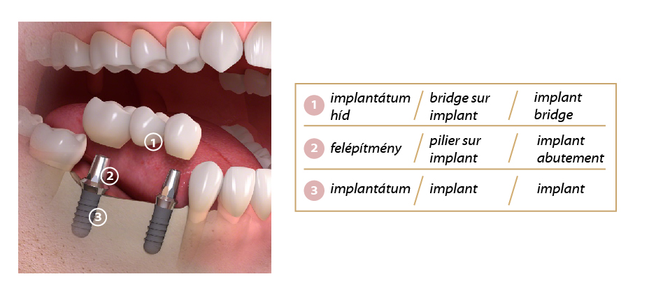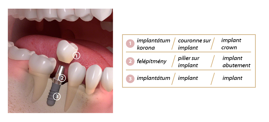 Az implantátum egy hiányzó fog műgyökere, amit az íny alá, a csontba ültetünk be. Miután becsontosodik az implantátum (3 hónap), elkészítjük rá a fogpótlást (korona vagy híd). Az implantátum és a korona között egy felépítmény (abutment) helyezkedik el, ezt becsavarjuk az implantátumba, és valójában ez a felépítmény tartja meg (mint egy lecsiszolt fogcsonk) a koronát. Rögzítés szempontjából kétféle koronát lehet készíteni az implantátumra: ragasztható vagy csavarozható koronát.