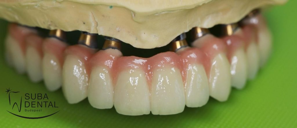 - ragasztható fémkerámia vagy fém-mentes (E.Max vagy Cirkon) korona. A ragasztható implantátum korona azt jelenti, hogy a fogpótlás (korona vagy híd) egy speciális ragasztócement segítségével rögzül a felépítményen.