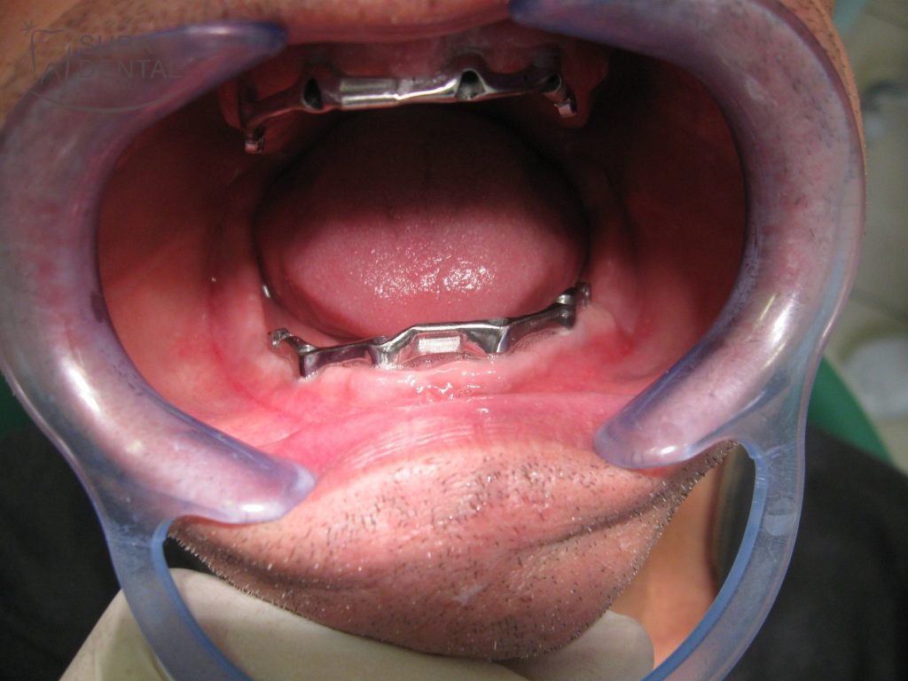 Az elkészült CT felvétel alapján az előzetes tervezésünk megvalósíthatónak bizonyult, és nincs akadálya a tervezett implantátumok beültetésének. El is végeztük a 4-4 darab implantátum beültetését egy ülésben, páciensünk kérésére szintén alkalmaztuk a PRF technológiát. A foghúzás után készített ideiglenes fogsorokat az implantátumok behelyezését követően alábéleltük a megváltozott anatómiai viszonyoknak megfelelően, hogy a 6 hónapos gyógyulási idő alatt is hordhatók legyenek.