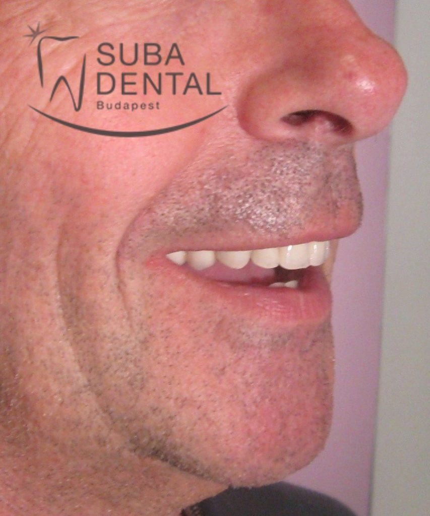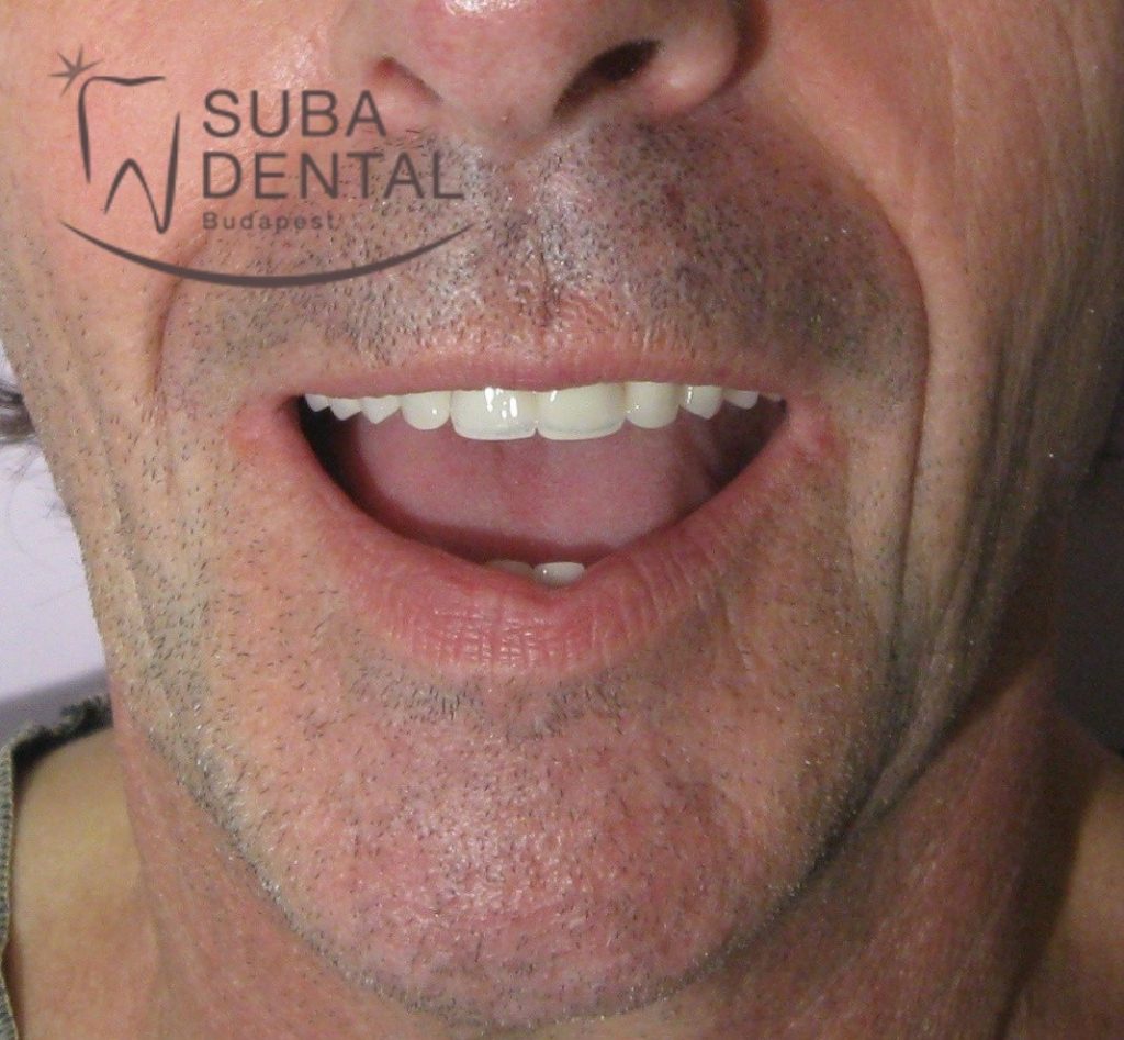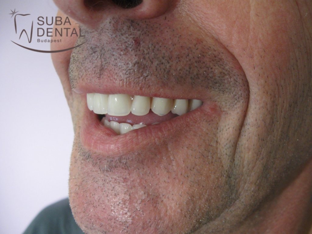 Páciensünk a kezelés végeztével elégedetten és nagyon boldogan távozott új fogaival. Azonban a garancia megőrzése érdekében rendszeresen ellenőrzéseken, szájhigiéniai kezeléseken, professzionális fogkő-eltávolításon kell részt vennie. Elmagyaráztuk és megmutattuk, hogy a fogsort nagyon fontos tisztán tartani. Lehetőség szerint minden evés után ki kell venni, és meg kell tisztítani protézistisztító kefével! A szájban lévő implantátumokat és a stéget naponta nagyon alaposan meg kell tisztítani fogkefével, fogkrémmel, illetve a stég alatt és az implantátumok mellett Super Flossal és interdentális kefével.