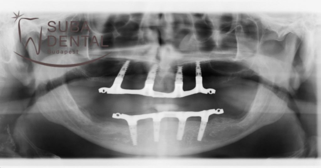 Az első konzultációs időpont alkalmával páciensünk egy általa készítetett panorámaröntgen-felvétellel érkezett, így nem volt szükség új felvétel készítésére. A klinikai vizsgálat és a panorámaröngen alapján megállapíthatóvá vált, hogy a fogak valóban nagyon rossz állapotvan vannak, és sajnos menthetetlenné váltak.